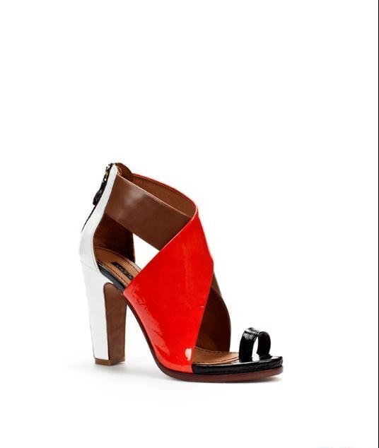 حذاء من الجلد ملون بين البني والأحمر والأبيض والأسود بكعب متوسط السمك والارتفاع .. يتناسب مع أزياء بأحد الألوان الموجودة فيه