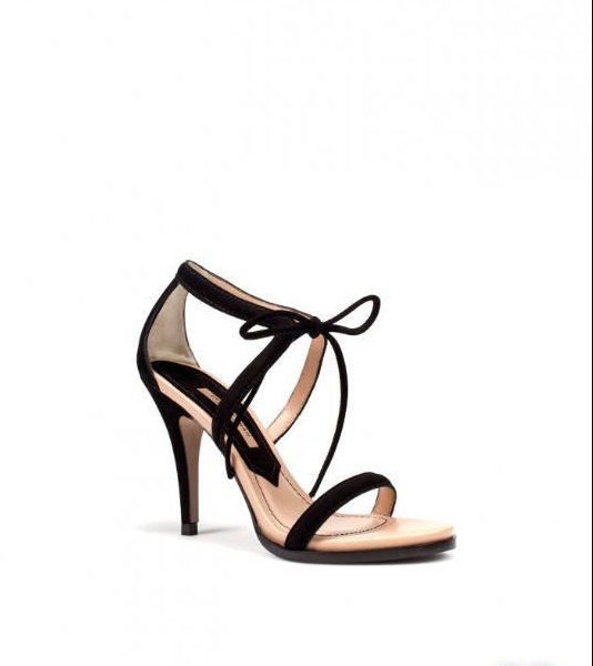 الصندل اسود أغلبه مفتوح .. برابطة فيونكة حول نهاية الساق من الأمام .. الكعب رفيع ومرتفع .. ويتناسب مع فستان جذاب .. وسيكون أفضل في وقت المساء