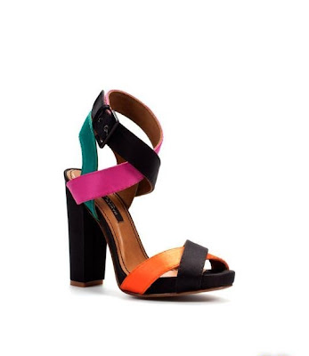 حذاء يجمع بين ألوان الربيع “وردى وتركواز وبرتقالي” مع الأسود بقفل معدني .. الكعب مرتفع وسميك ويتناسب أيضا مع فستان بأحد الألوان الموجودة فيه