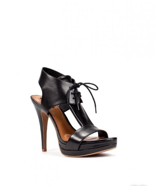 الحذاء أسود من الجلد برباط أمامي وكعب رفيع مرتفع .. يتناسب الحذاء مع فستان قصير أو طويل أو سروال قصير