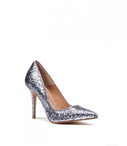 الحذاء للسهرات الخاصة باللون الفضي البراق بكعب مرتفع ورفيع .. يحتاج فستان سهرة به لون فضي